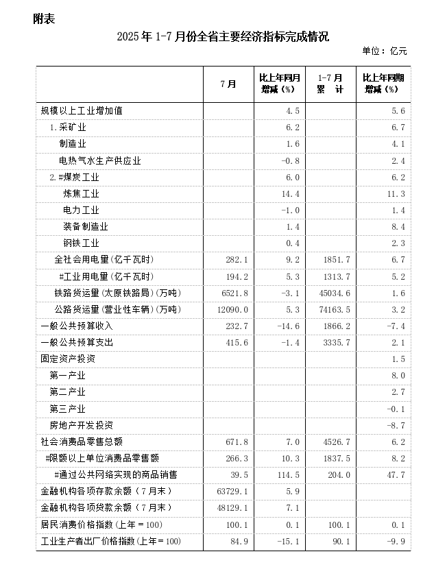 總的來看,在宏觀政策持續(xù)發(fā)力顯效和全省上下共同努力下,1-7月份全省經(jīng)濟運行頂住壓力、平穩(wěn)增長。同時也要看到,部分行業(yè)領(lǐng)域增速有所回落,下階段經(jīng)濟延續(xù)穩(wěn)定增長勢頭仍存壓力。下一步,要深入學(xué)習(xí)貫徹習(xí)近平總書記考察山西重要講話重要指示精神,按照省委十二屆十次全會部署安排,堅定落實各項宏觀政策,深入實施提振消費專項行動,擴圍提質(zhì)實施“兩新”政策,積極擴大有效投資,高質(zhì)量推動“兩重”建設(shè),奮力推動全省經(jīng)濟持續(xù)穩(wěn)定運行、回升向好。