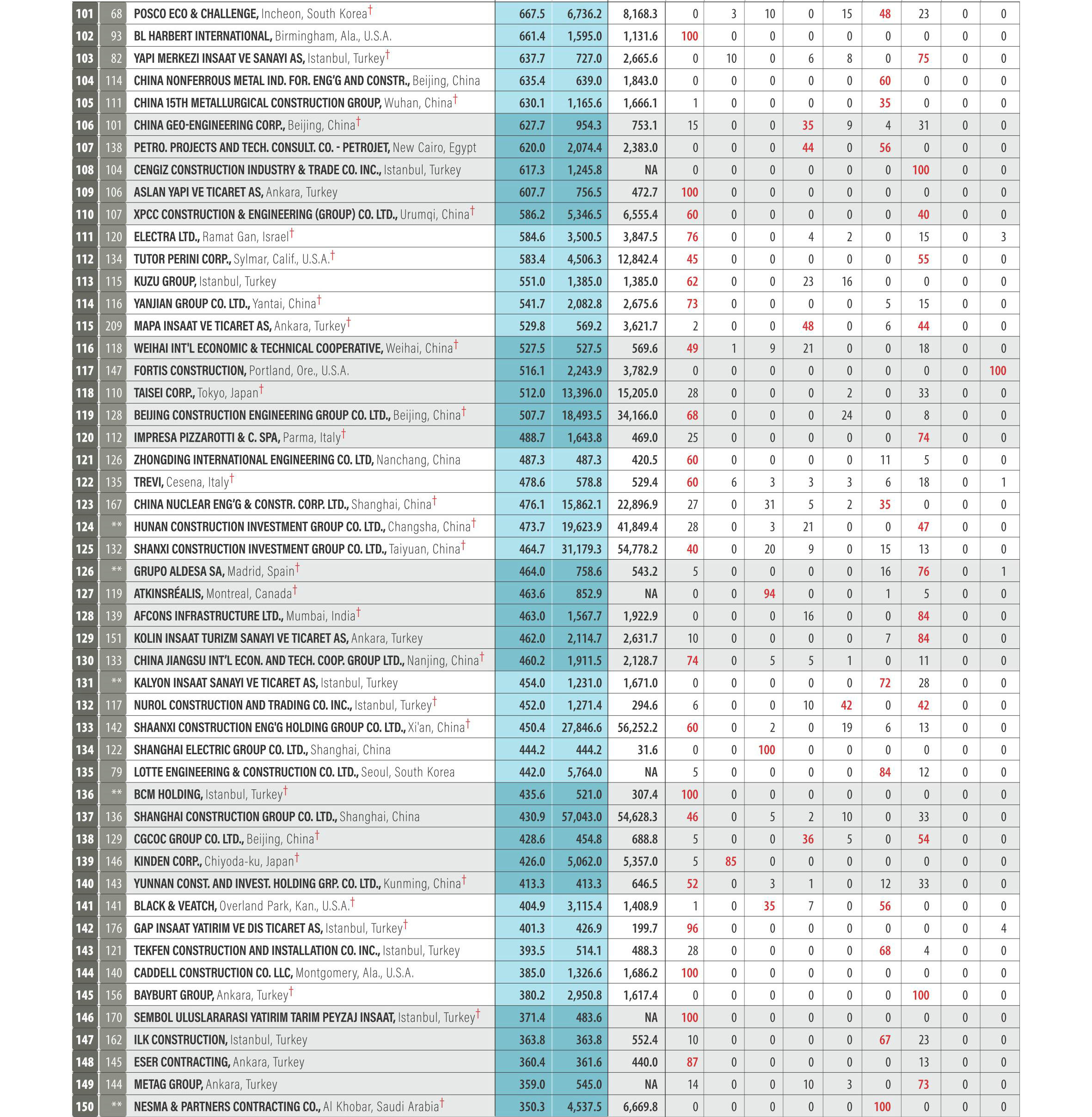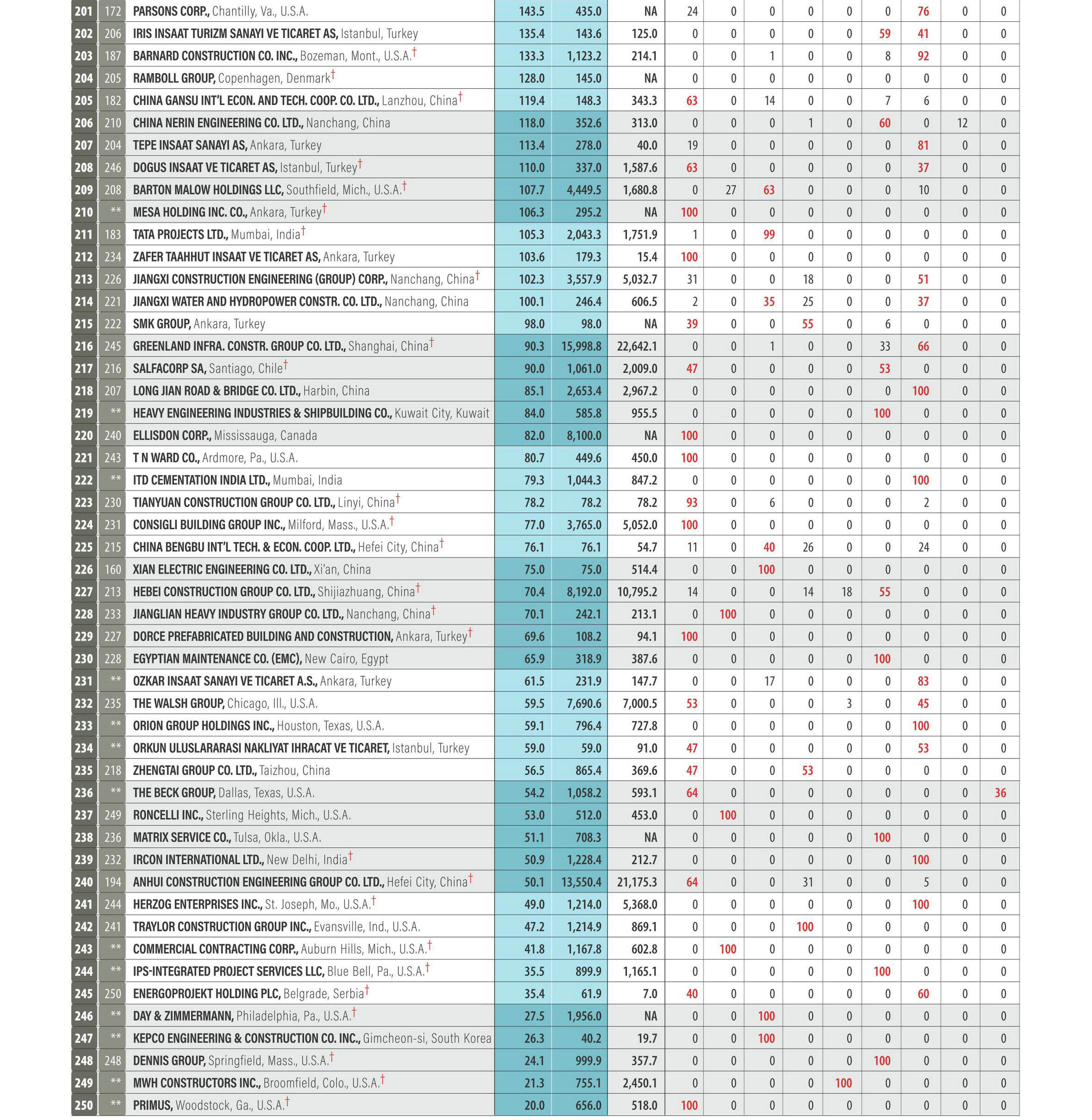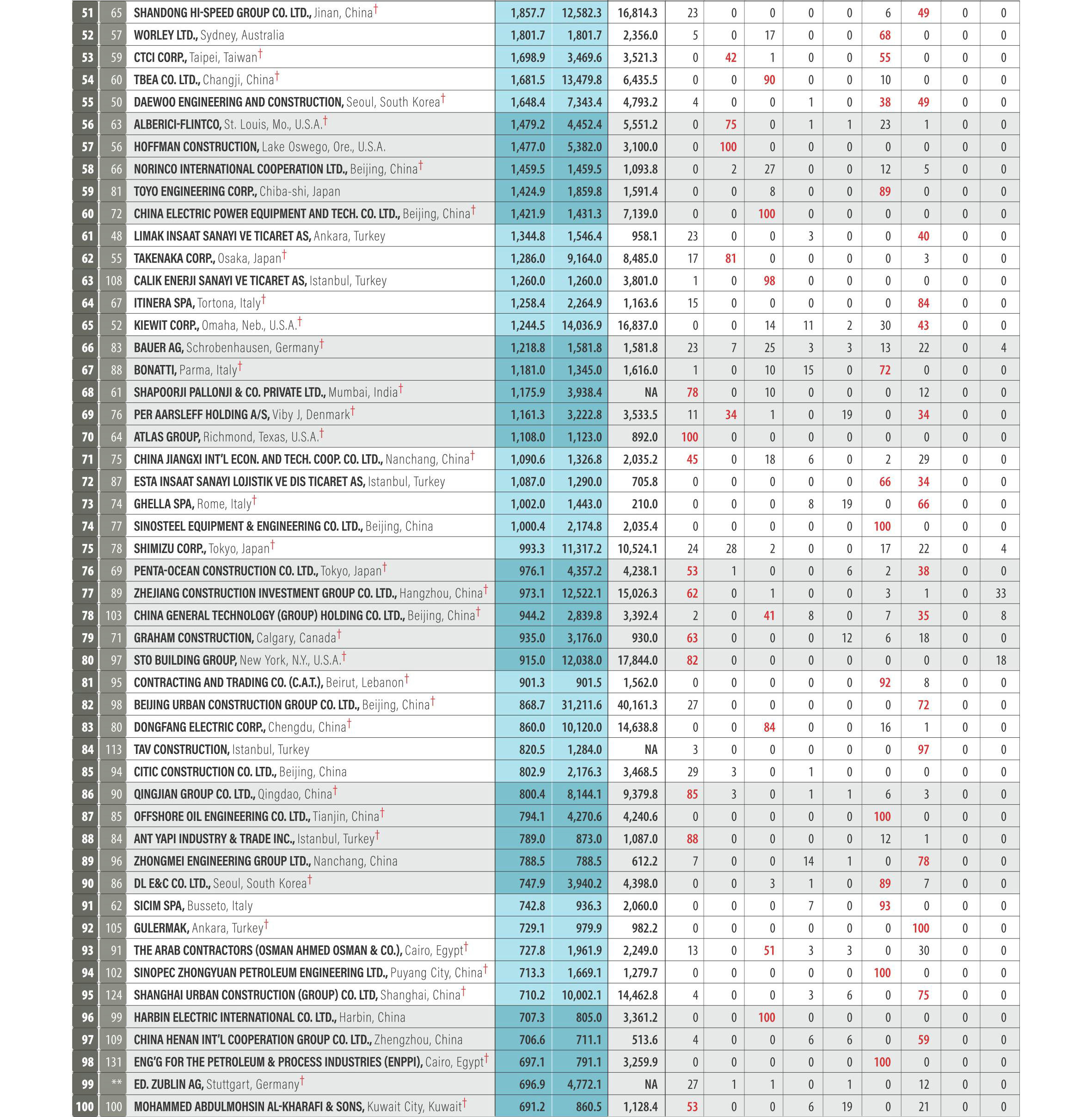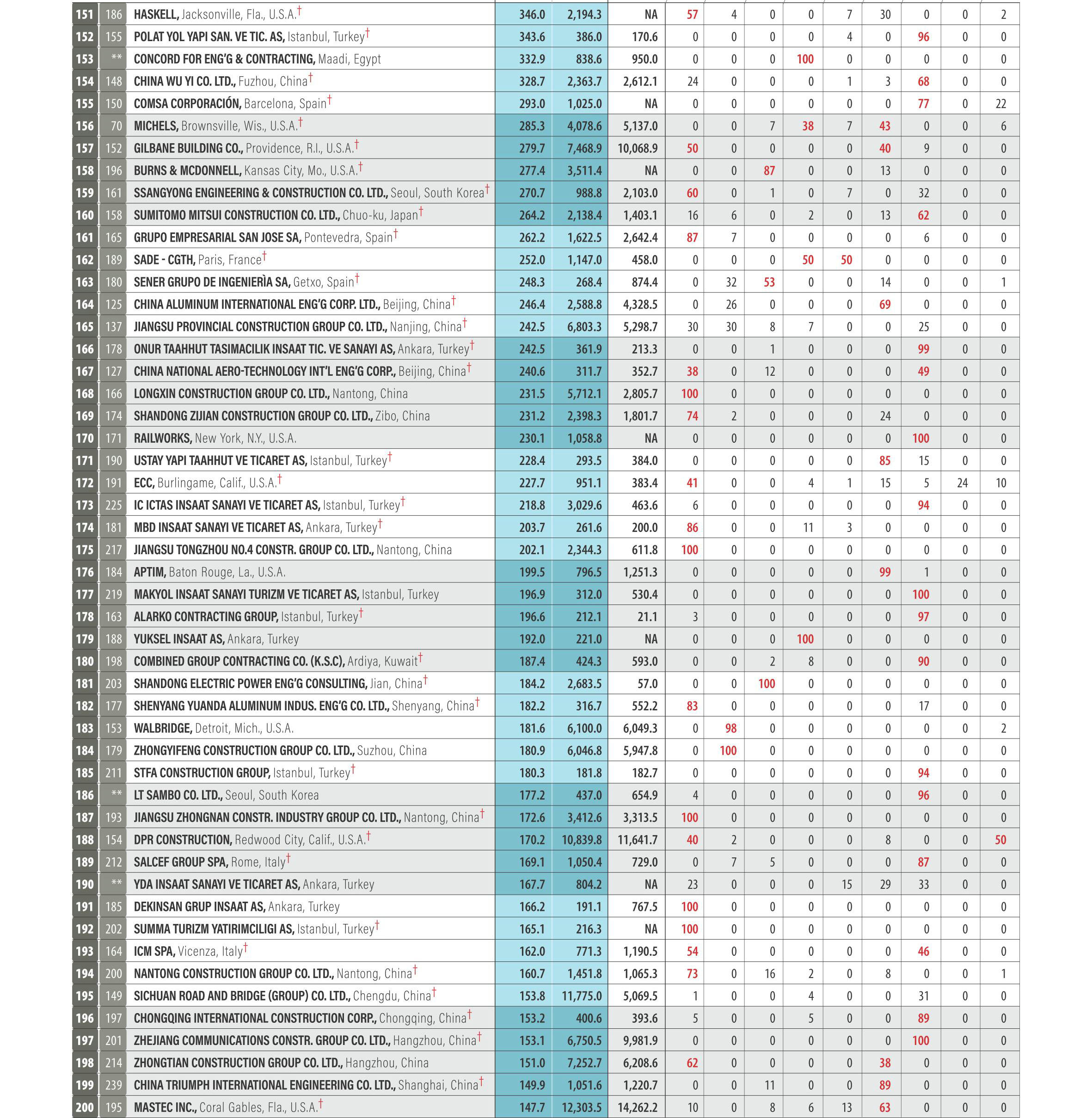 在ENR同期發(fā)布的“最大250家全球承包商”榜單中(以國內(nèi)與國際營業(yè)額合計排序),共7家中國企業(yè)進(jìn)入前10強(qiáng),與上年度持平,其中中國建筑、中國中鐵、中國鐵建、中國交建包攬前4位,中國電建排名第6位、中冶科工排名第7位、上海建工排名第8位。此外,中國能建、北京城建、山西建投、中國化學(xué)工程、陜西建工、湖南建投、北京建工、綠地大基建、中國核建、安徽建工、特變電工、中油工程、山東高速、浙江建投、四川路橋、東方電氣、上海城建等企業(yè)進(jìn)入榜單前50強(qiáng),體現(xiàn)了中國企業(yè)在全球基建行業(yè)的重要地位。