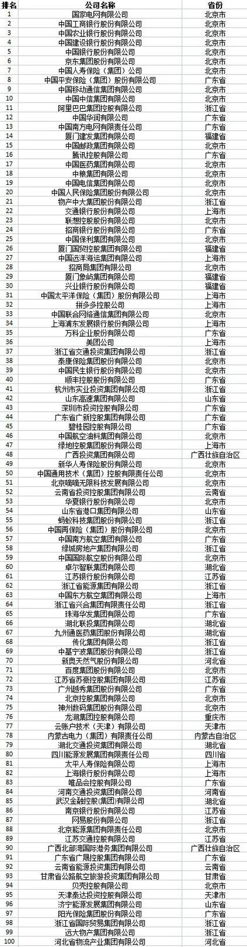 位列榜單前10位的企業(yè)分別是:國家電網(wǎng)有限公司、中國工商銀行股份有限公司、中國農(nóng)業(yè)銀行股份有限公司、中國建設(shè)銀行股份有限公司、中國銀行股份有限公司、京東集團(tuán)股份有限公司、中國人壽保險(集團(tuán))公司、中國平安保險(集團(tuán))股份有限公司、中國移動通信集團(tuán)有限公司和中國中信集團(tuán)有限公司。