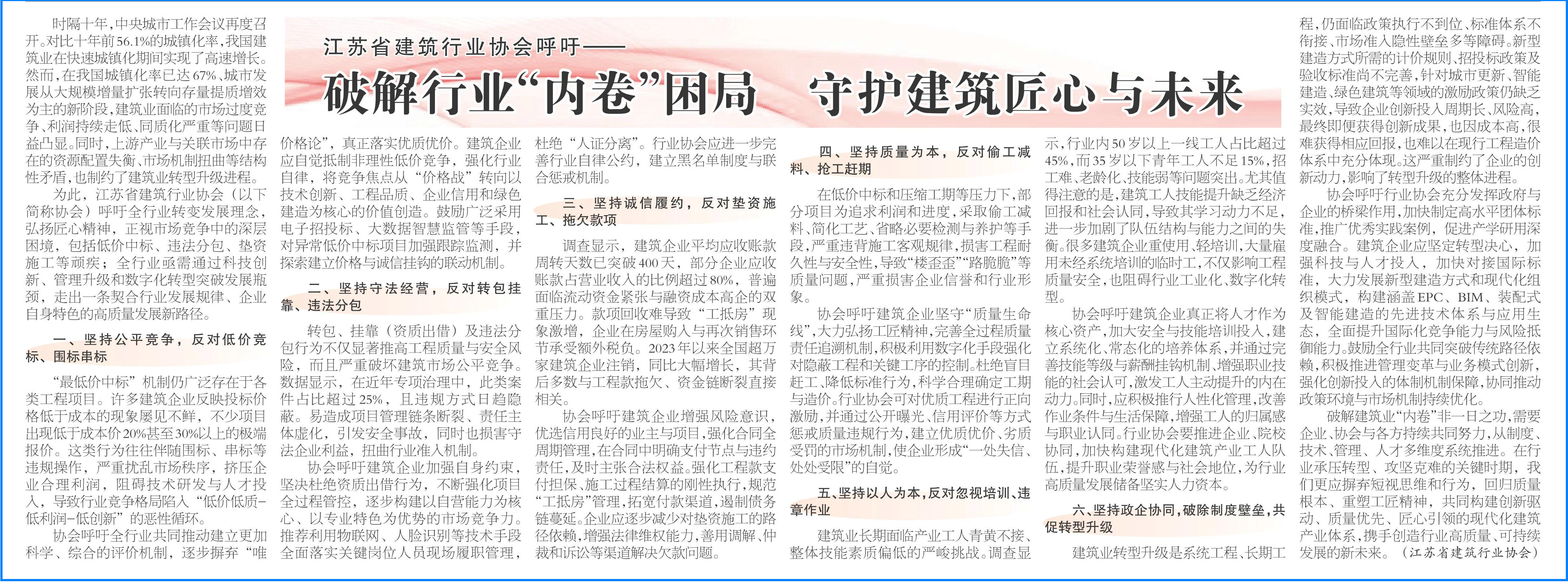 為此,江蘇省建筑行業(yè)協(xié)會(以下簡稱協(xié)會)呼吁全行業(yè)轉(zhuǎn)變發(fā)展理念,弘揚(yáng)匠心精神,正視市場競爭中的深層困境,包括低價中標(biāo)、違法分包、墊資施工等頑疾;全行業(yè)亟需通過科技創(chuàng)新、管理升級和數(shù)字化轉(zhuǎn)型突破發(fā)展瓶頸,走出一條契合行業(yè)發(fā)展規(guī)律、企業(yè)自身特色的高質(zhì)量發(fā)展新路徑。