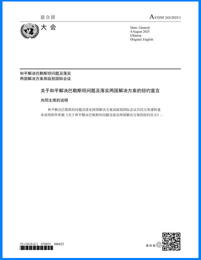《紐約宣言》是今年7月在聯(lián)合國總部召開的有關(guān)巴勒斯坦問題國際會議產(chǎn)生的一個成果,該會議由法國和沙特阿拉伯共同主辦,并將于本月下旬繼續(xù)舉行。
