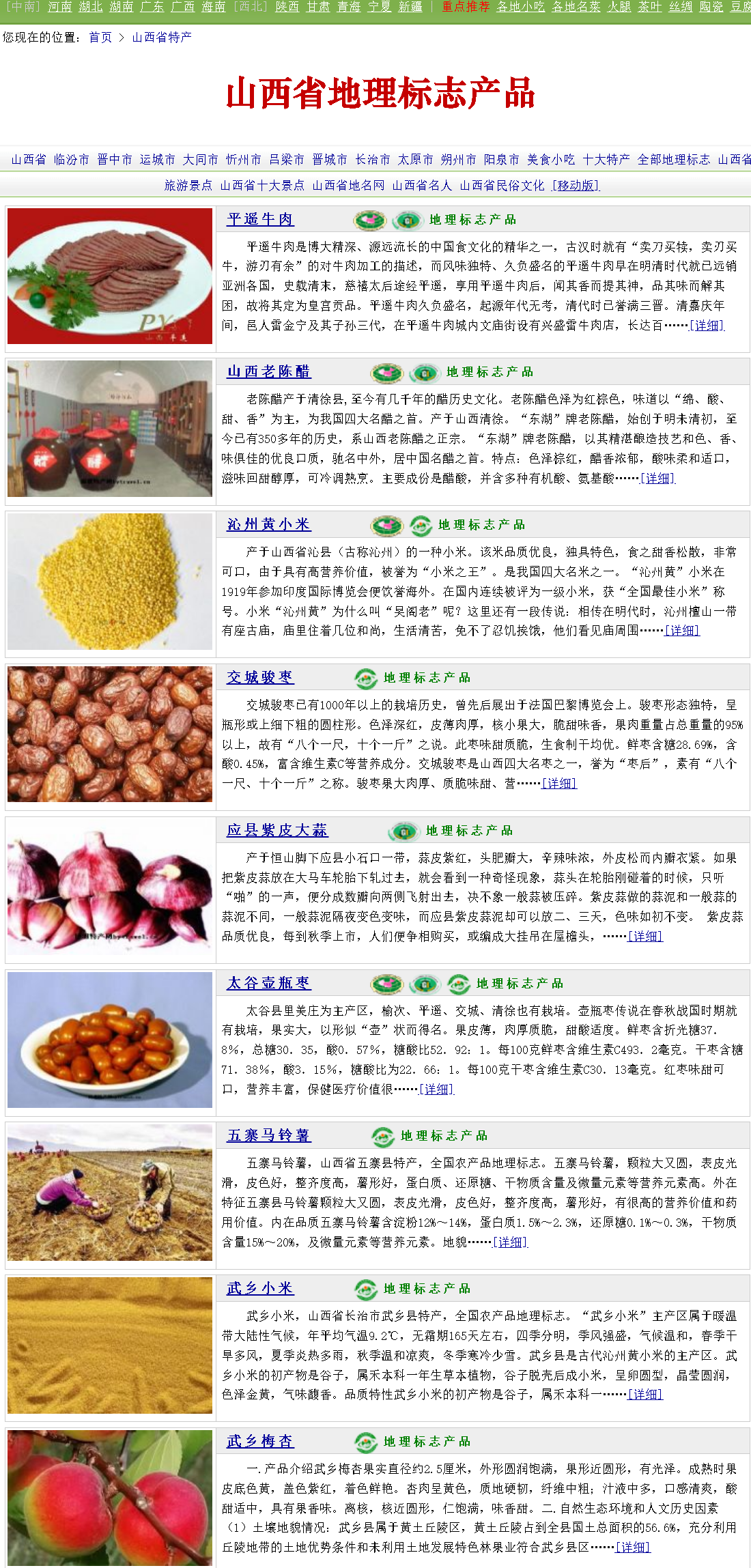 *平遙牛肉 * 山西老陳醋 * 沁州黃小米 * 交城駿棗 * 應縣紫皮大蒜 * 太谷壺瓶棗 * 五寨馬鈴薯 * 武鄉(xiāng)小米* 武鄉(xiāng)梅杏 * 代縣大米 * 大寧西瓜 * 王過酥梨 * 壽陽豆腐干 * 澄泥硯 * 平定黃瓜干 *靈丘蕎麥 * 上黨黨參 * 柳林大紅棗 * 太谷餅 * 古縣核桃 * 祁縣酥梨 * 大同黃花 * 晉祠大米* 襄垣手工掛面 * 萬榮蘋果 * 沁水黃小米 * 黎城核桃 * 靈石荊條蜂蜜 * 平遙推光漆器 * 孝義柿子 *左權綿核桃 * 陽城山茱萸 * 芮城屯屯棗 * 平遙長山藥 * 清徐葡萄 * 靈境莜麥 * 興縣小米 * 運城蘋果* 冀村長山藥 * 芮城菊花 * 平遙酥梨 * 賀家莊鮮桃 * 榆次蘋果 * 上黨高粱 * 平順花椒 *平定冠山連翹茶 * 興縣大明綠豆 * 五寨紅蕓豆 * 陽城花椒 * 澤州黃小米 * 涑川茼蒿 * 右衛(wèi)土豆 * 東趙小白梨* 和順肉牛 * 神池胡油 * 忻州香瓜 * 陽城蠶繭 * 懷仁羔羊肉 * 大同小明綠豆 * 沁州核桃 *義井甜瓜 * 永濟大櫻桃 * 河峪小米 * 右玉羊肉 * 榆社洋槐蜜 * 芮城花椒 * 長子大青椒 * 西回小米* 大寧河雞 * 懷仁陶瓷 * 梧桐山藥 * 隆化小米 * 沁州南瓜子 * 隰縣梨 * 恒山黃芪 *澤州紅山楂 * 壽陽小米 * 長凝大蒜 * 汾州核桃 * 稷山板棗 * 官灘棗 * 平魯紅山蕎麥 * 永濟蘆筍* 萬榮大黃牛 * 洪洞蓮藕 * 熬腦大蔥 * 絳縣山楂 * 壺關黨參 * 榆社笨雞蛋 * 襄陵蓮藕 *孝義核桃 * 左云苦蕎 * 廣靈大尾羊 * 廣靈小米 * 鄉(xiāng)寧翅果 * 洪井三皇小米 * 嵐縣馬鈴薯 * 長治堆錦* 沁水黑木耳 * 柏籽羊肉 * 清徐老陳醋 * 臨縣紅棗 * 萬泉大蔥 * 臨猗蘋果 * 陽高長城羊肉 *平定荊花蜂蜜 * 潞州黃芩 * 上黨連翹 * 聞喜宰相花饃 * 代縣酥梨 * 芮城蘆筍 * 聞喜蓮藕 * 絳縣大櫻桃* 連伯韭菜 * 泗交黑木耳 * 仙人紅薯 * 神池黑豆 * 神池黍子 * 沁水黑山羊 * 巴公大蔥 *神池胡麻 * 應縣陶瓷 * 汾西梨 * 靈丘大青背山羊 * 原平紫皮大蒜 * 隰縣玉露香梨 * 平定砂器 * 晉城荊條花蜂蜜* 曲沃麥茬羊肉 * 廣靈苦蕎 * 廣靈大尾羊羊肉 * 北董大蒜 * 清徐沙金紅杏 * 霍州核桃 * 沁水刺槐蜂蜜 *平陸蘋果 * 天鎮(zhèn)唐杏 * 應縣胡蘿卜 * 偏關羊肉 * 偏關小米 * 涔山芥菜 * 寧武莜麥 * 神池羊肉* 定襄甜瓜 * 霍州蘋果 * 斗山杏仁 * 析城山小米 * 汾陽釀酒高粱 * 吉縣蘋果 * 應縣青椒 *永和條棗 * 岢嵐紅蕓豆 * 大寧紅皮小米 * 繁峙黃米 * 高平大黃梨 * 神池莜麥 * 北景柿子 * 芮城蘋果* 臨晉江石榴 * 南林交蓮藕 * 陽曲小米 * 蒲縣核桃 * 平順潞黨參 * 陵川黑山羊 * 孫家灣香椿 *趙康辣椒 * 杜馬百合 * 陽城桑葚 * 安澤連翹 * 戎子酒莊葡萄酒 * 交城梨棗 * 壺關旱地西紅柿 * 萬榮三白瓜* 運城鹽池黑泥 * 蒲縣馬鈴薯 * 廣靈畫眉驢 * 七里坡山楂 * 岢嵐柏籽羊肉 * 忻州糯玉米 * 臨縣開陽大棗 *吳王渡黃河鱉 * 運城鹽池大鹽 * 杏花村酒 * 竹葉青酒 *