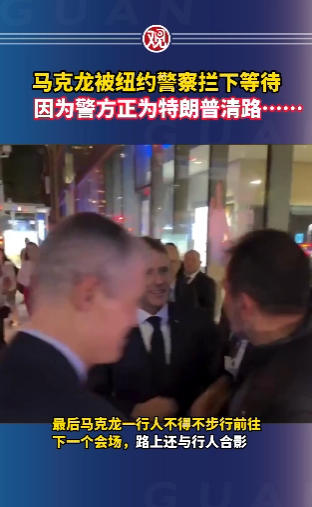 視頻顯示,馬克龍乘坐的車輛被紐約警察攔了下來,馬克龍隨即下車詢問情況。一名警察向馬克龍道歉,他解釋說,為了給特朗普的車隊留出空間,道路已經(jīng)被封鎖。這名警察對馬克龍說:“我很抱歉,總統(tǒng)先生,現(xiàn)在一切都被封鎖了?!?