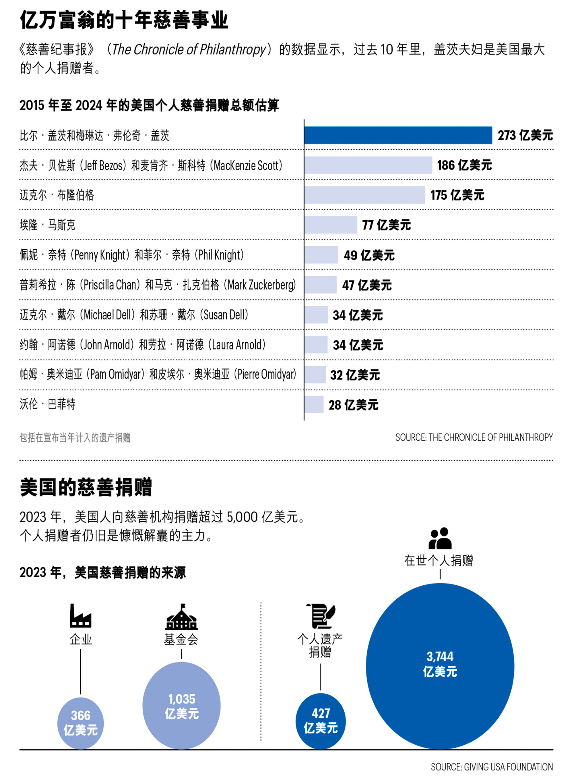 最后的成果是“捐贈誓言”(Giving Pledge),承諾在生前或去世后捐出至少一半財富?!拔覀兤鸪跸M梢哉业?0位到80位志同道合的慈善人士?!鄙w茨說。截至2024年7月,已經(jīng)有244人加入。簽署者包括商業(yè)界和不同意識形態(tài)領(lǐng)域的知名人士,比如對沖基金經(jīng)理比爾·阿克曼(Bill Ackman)、商界領(lǐng)袖兼政治家邁克爾·布隆伯格(Michael Bloomberg)以及LinkedIn的創(chuàng)始人里德·霍夫曼(Reid Hoffman)。