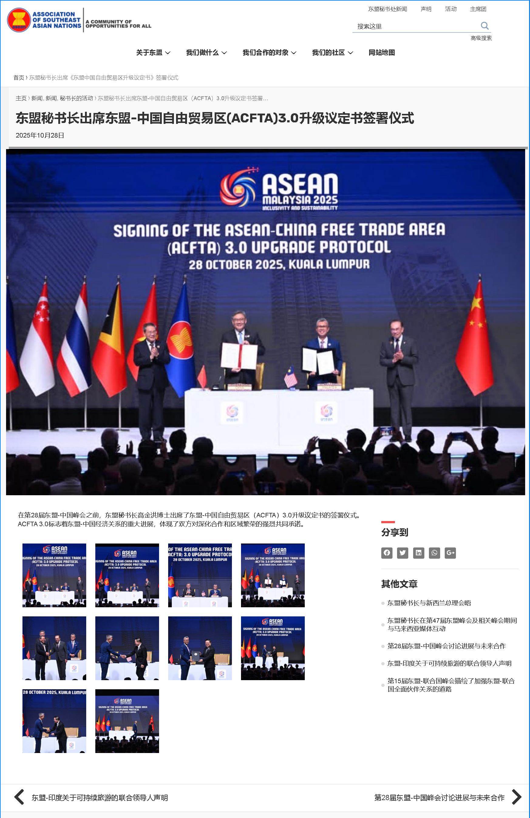 此后,雙方按照領(lǐng)導人指示,加緊開展個別剩余條款技術(shù)磋商及議定書文本法律審核等后續(xù)工作。經(jīng)過4次特別聯(lián)委會及多輪工作組磋商,雙方于2025年5月全面完成3.0版談判。2025年10月28日,雙方在馬來西亞吉隆坡召開的第28次中國—東盟領(lǐng)導人會議期間,正式簽署3.0版升級議定書。