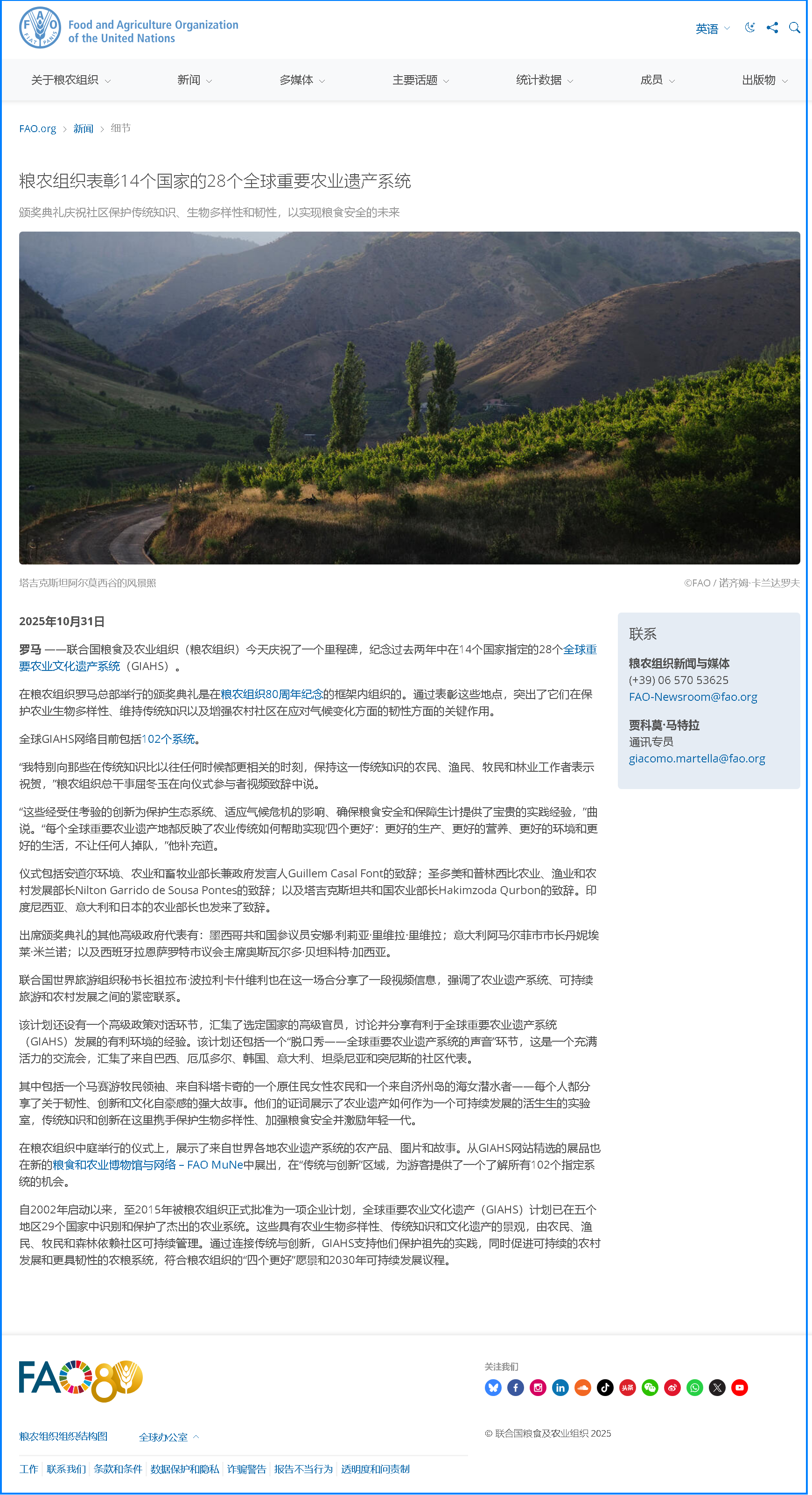 新華社羅馬10月31日電(記者刁澤)10月31日,由聯(lián)合國糧農(nóng)組織主辦的全球重要農(nóng)業(yè)文化遺產(chǎn)授牌儀式在意大利首都羅馬舉行。此次活動是糧農(nóng)組織成立80周年系列活動之一,為2023年以來新認(rèn)定的全球重要農(nóng)業(yè)文化遺產(chǎn)舉辦集中授牌與交流。
