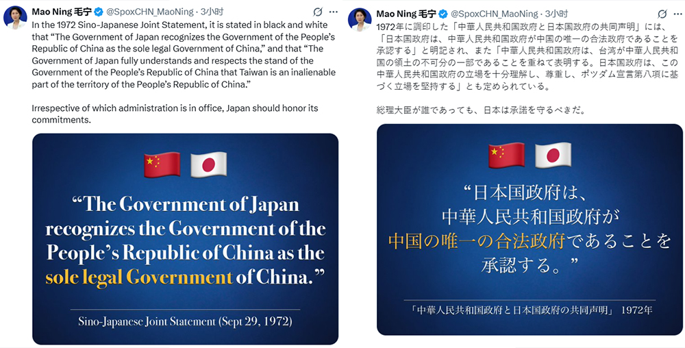 11月16日,中國外交部發(fā)言人毛寧在X網(wǎng)站用英語、日語雙語發(fā)布2組共4張海報(bào),援引1972年《中日聯(lián)合聲明》中涉臺內(nèi)容,提醒日方:“無論誰當(dāng)政,日本都必須信守承諾”。