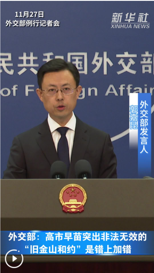 高市早苗首相對具有充分國際法效力且在《中日聯(lián)合聲明》和《中日和平友好條約》等雙邊文件中明確強(qiáng)調(diào)的《開羅宣言》《波茨坦公告》避而不談,卻唯一突出非法無效的“舊金山和約”,這再次表明,她時(shí)至今日仍不思悔改,仍在持續(xù)損害中日四個政治文件精神確定的中日關(guān)系政治基礎(chǔ),無視聯(lián)合國權(quán)威,公然挑戰(zhàn)戰(zhàn)后國際秩序和國際法基本準(zhǔn)則,甚至妄圖煽炒所謂“臺灣地位未定論”。這是錯上加錯,中方對此堅(jiān)決反對,國際社會也應(yīng)高度警惕。我們再次敦促日方切實(shí)反思糾錯,撤回錯誤言論,以實(shí)際行動體現(xiàn)對華承諾,以實(shí)際行動履行作為聯(lián)合國會員國起碼應(yīng)盡的義務(wù)。