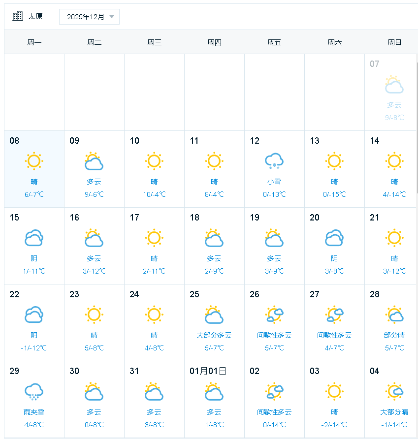 根據(jù)太原市氣象臺預報,本周我市以晴天間多云天氣為主。受冷空氣影響,12月11日至13日有大風、降溫天氣。其中,12日有小到中雪,部分地區(qū)大雪,伴有4~6級、短時7級或以上西北風,氣溫明顯下降。