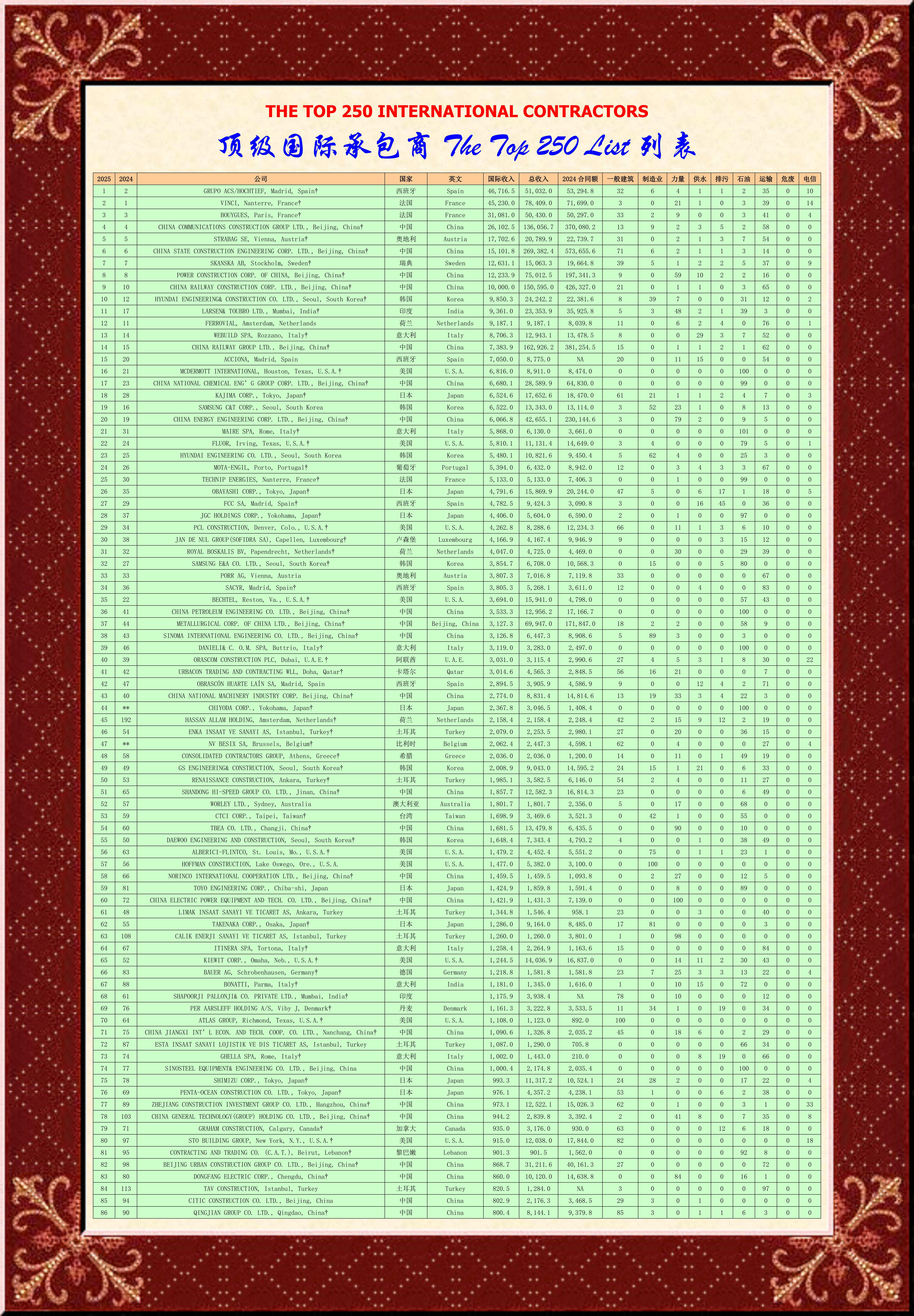 序號 2025 2024 國家 公司 國際收入 總收入 2024合同額 一般建筑 制造業(yè) 力量 供水 排污 石油 運輸 危廢 電信
