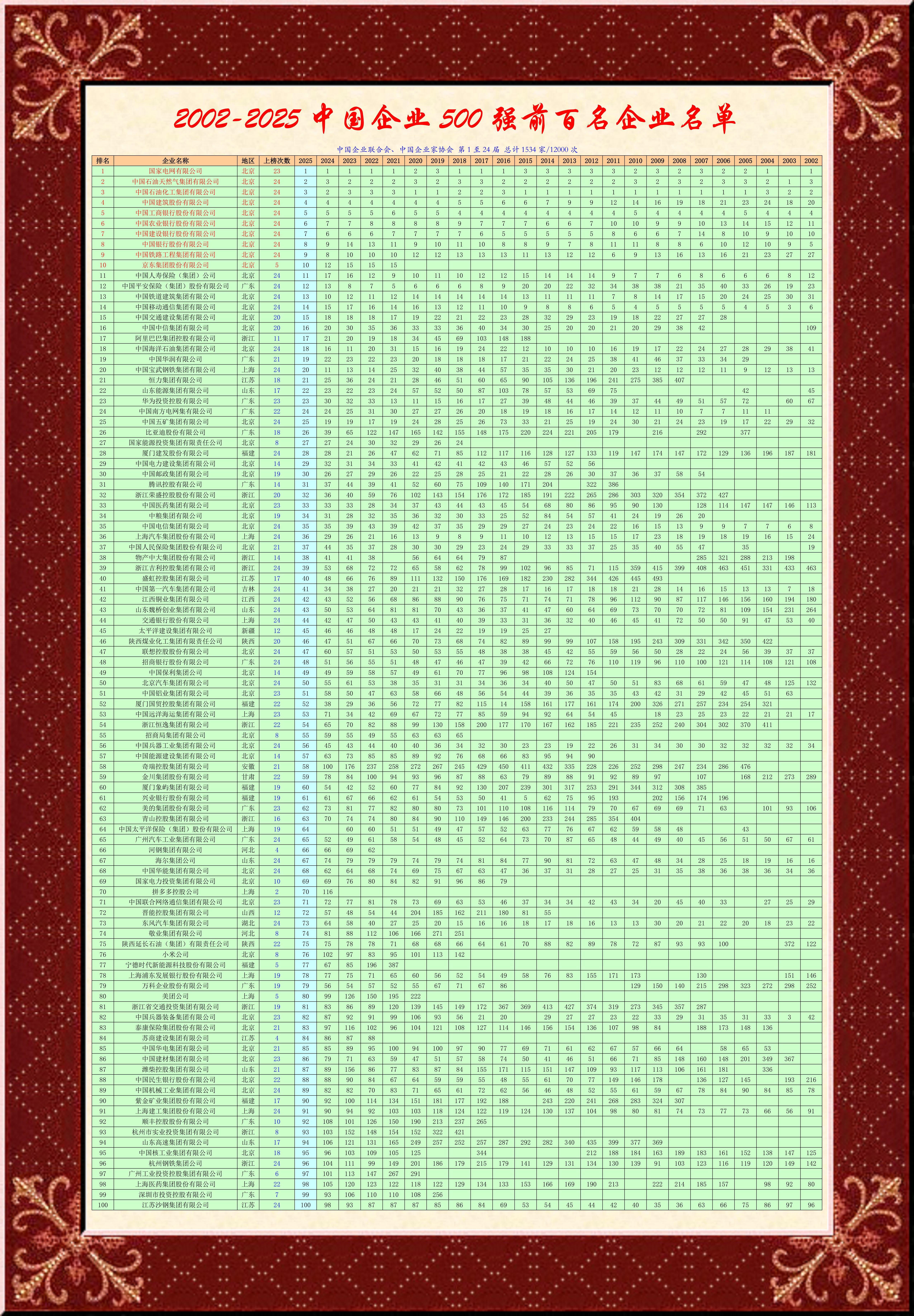 【學(xué)習(xí)園地】2025中國企業(yè)500強前百名上榜次數(shù)明細表