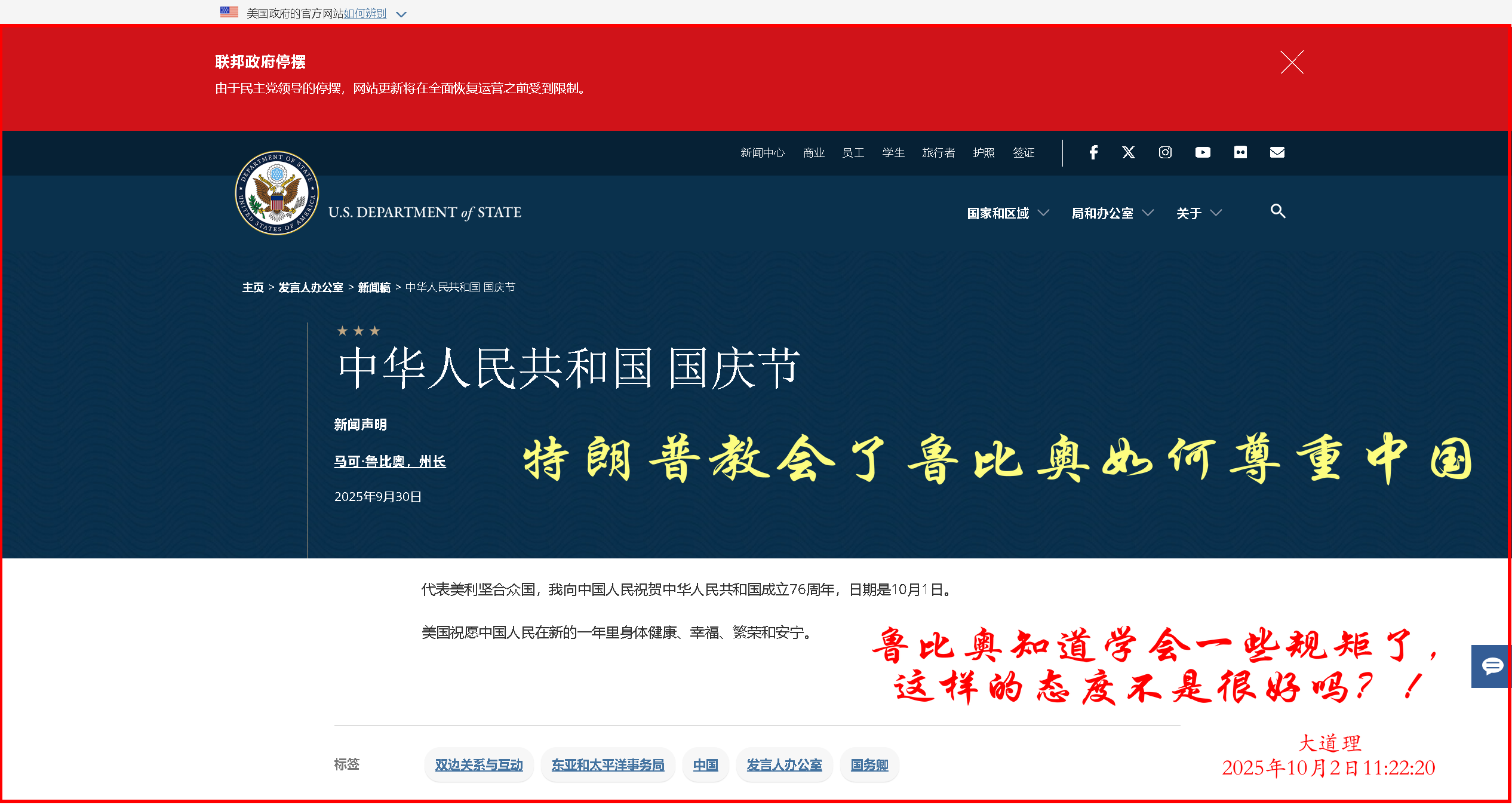 根據(jù)美國國務(wù)院網(wǎng)站當(dāng)?shù)貢r(shí)間9月30日消息,美國國務(wù)卿魯比奧發(fā)表簡短聲明:我謹(jǐn)代表美利堅(jiān)合眾國,就中華人民共和國成立76周年表示祝賀。